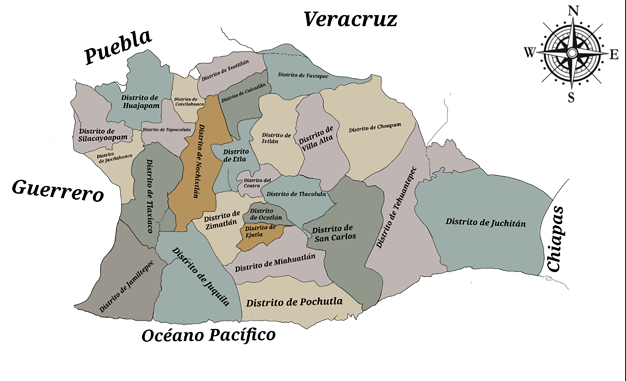 El Distrito de Miahuatlán ha sido uno de los más importantes del estado, territorialmente abarca una gran extensión de la Sierra Sur y fue uno de los primeros distritos que inició con sembradíos de café; su producción agrícola inició con inversionistas nacionales, la mayoría de origen oaxaqueño, particularmente de apellidos de familias originarias de los distritos de Miahuatlán, Pochutla, así como de la ciudad Capital. Entre 1832 y hasta 1940, Oaxaca tuvo 26 distritos político-administrativos; en 1885 el estado tenía un total de 884,909 habitantes. Los distritos de Etla, Huajuapam, Ocotlán, Tlacolula, Tlaxiaco y Zimatlán tenían poblaciones mayores a 30,000 habitantes. El estado se ha caracterizado por tener una población dispersa en su territorio, aunque la zona más poblada ha sido el Distrito Centro, en 1895 concentraba el 7.60% de la población con un total de 66,381 habitantes (Commons, 2009).