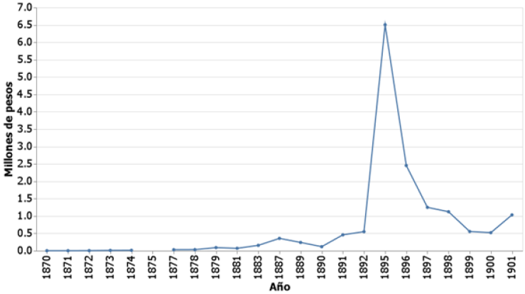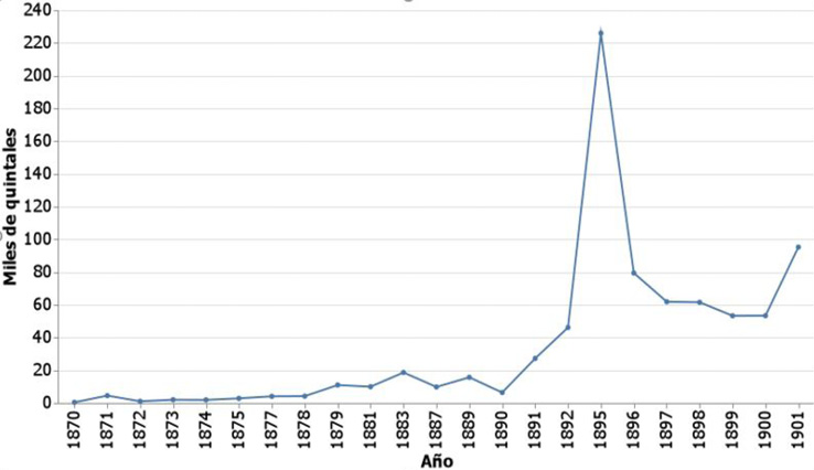 Enseguida, la figura 3 muestra la producción estatal de café, medida en quintales, para el periodo de 1870 a 1901, mientras que la figura 4 muestra el valor de esa producción, medida en pesos. Se observa que la producción de café se mantuvo constante para el periodo de 1870 a 1890, con ligeras variaciones en la década de 1880. A partir de 1890 es cuando se observa un crecimiento sustancial en la producción de este bien, alcanzando su máximo en 1895, esto debido a que los plantíos que se habían sembrado y proliferado durante las dos décadas anteriores ya habían alcanzado un grado de madurez suficiente para multiplicar su cantidad de frutos. Si no se considera la producción de 1895, la cantidad de quintales promedio producidos en Oaxaca durante la década de 1890 fue poco más de 2.6 veces la cantidad de quintales promedio durante la década de 1880 y alrededor de 12.6 veces la cantidad de quintales promedio producidos durante la década de 1870. De forma semejante, si no se considera el valor de la producción de 1895, el valor promedio de la década de 1890 es 3.5 veces el valor promedio de la producción durante la década de 1880 y es 38.5 veces el valor promedio de la producción de la década de 1870, sin embargo, debe considerarse que este valor está medido en pesos y que el proceso inflacionario no permite realizar una comparación exacta entre esos valores.