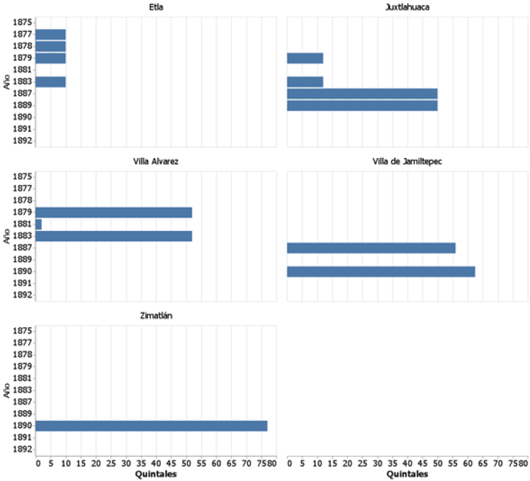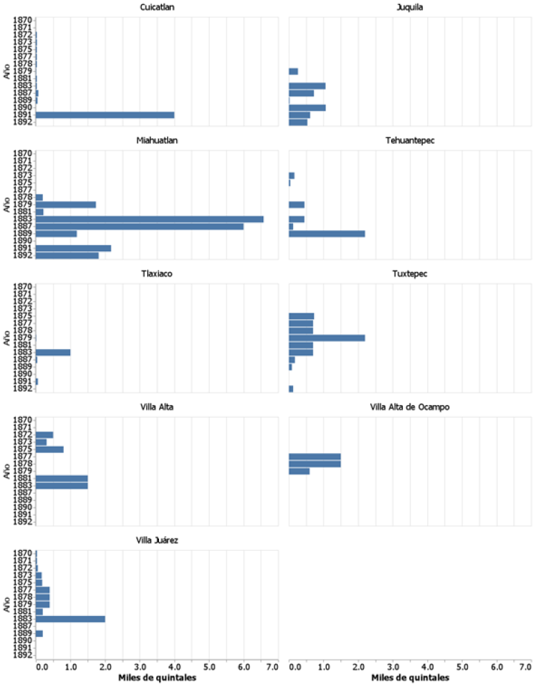 En la figura 5 se presentan los distritos que tuvieron una producción menor a 80 quintales para algunos años del periodo de 1870 a 1892. En este grupo de distritos se observa que no hubo una gran variación en la producción de café. Villa de Jamiltepec y Zimatlán son los distritos que tuvieron mayor producción, alcanzaron su máxima en 1890 y, después de este año, su producción descendió debido a que las condiciones del clima y suelo no eran las mejores.