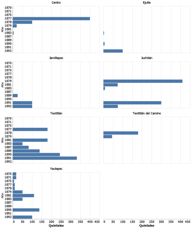 En la figura 6 se agrupan los distritos que tuvieron una producción en el rango de 0 a 410 quintales para algunos años en el periodo de 1875 a 1892. En este grupo se observa una gran variabilidad, en el que los distritos alcanzaron su producción máxima en los extremos del periodo, por ejemplo, el Distrito Centro concentró una producción de 400 quintales en 1877. Dos de los distritos con mayor producción en este grupo son Teotitlán y Juchitán. Teotitlán tuvo una producción de 180 quintales en 1877 y 1881, pero en 1883 su producción disminuyó a 50 quintales, para, a partir de ese año, comenzar un ascenso hasta alcanzar su máximo en 1891 con 332 quintales. Juchitán tuvo la producción más elevada en 1879, con 410 quintales, y su segunda producción más alta fue 11 años después, en 1891, al lograr 300 quintales; mientras que en los años intermedios su producción fue menor a la de ese par de años.