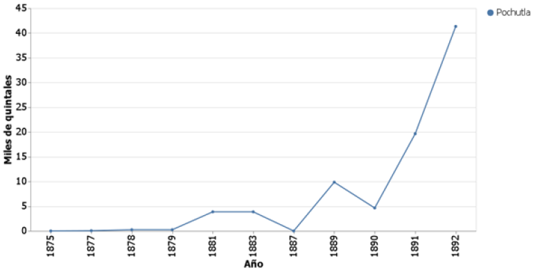 En la figura 8 se presenta la producción de café en quintales del Distrito de Pochutla, para algunos años del periodo 1875 a 1892. Fue en 1892 cuando Pochutla alcanzó su producción máxima con 41,330 quintales. Al igual que en las figuras 3 y 4, la producción de este distrito alcanzó sus niveles más altos hacia el final del periodo, además, se puede observar una tendencia al alza. Cabe mencionar que en Pochutla se concentraba la producción de distintos municipios para ser comercializada y exportada por la aduana marítima de Puerto Ángel, región de la costa perteneciente a Pochutla.