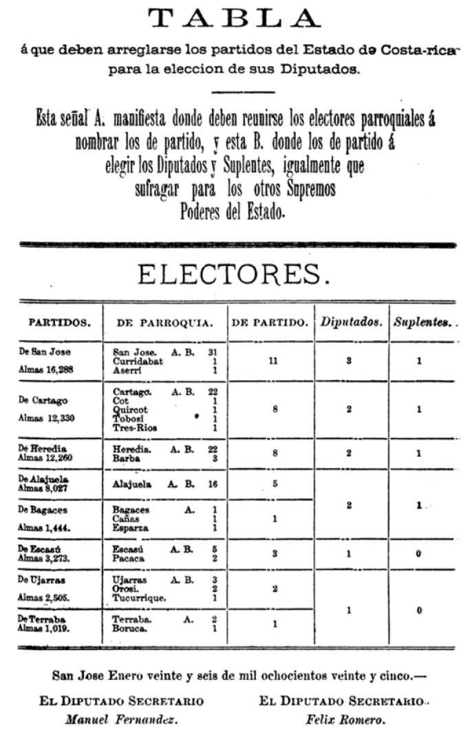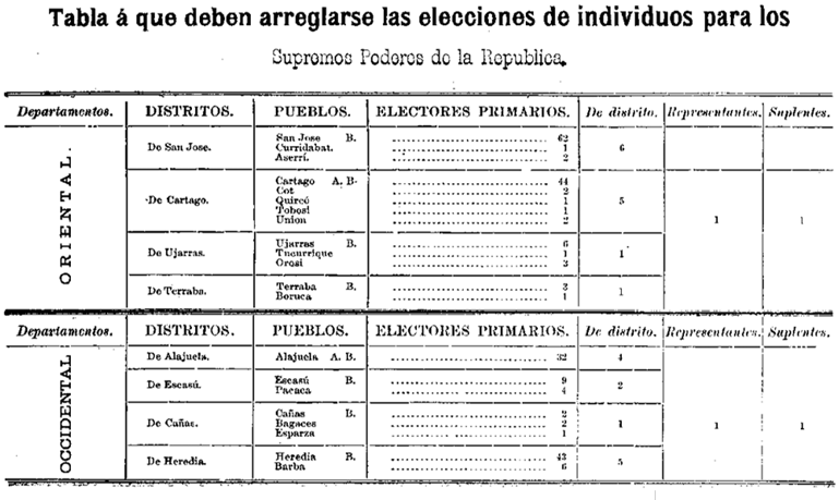 La tabla muestra la complejidad y funcionamiento de un sistema electoral con muchas etapas y varios niveles. Costa Rica fue el único estado que adoptó requisitos distintos para votar en las elecciones estatales y federales (Figura 2). Presumiblemente, los costarricenses quisieron garantizar una mayor participación de los votantes en el estado con la población más pequeña en la que la representación legislativa por cada 30.000 o incluso 15.000 habitantes (las cifras seleccionadas por los otros Estados) produciría una legislatura estatal con cuatro miembros.