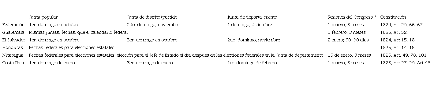 Posiblemente el signo más claro de la afiliación centroamericana al sistema representativo es la participación de los votantes. En teoría, los ejecutivos fueron elegidos por períodos de cuatro años; pero los tribunales supremos, las asambleas federales y estatales y los “poderes/senadores conservadores” rotaban un tercio o la mitad de sus miembros anualmente, cada dos años o cada tres años. Las elecciones municipales se celebraban anualmente. Así pues, se produjo todo un intrincado ciclo de elecciones anuales. En realidad, el número de reuniones electorales a las que tuvieron que asistir los electores sobrepasó a las previstas en las constituciones. Las constituciones exigían que se celebraran reuniones populares un domingo determinado, seguidas de juntas de partido dos semanas o un mes después, y de juntas de departamento dos semanas o un mes después de esa fecha. De acuerdo con este calendario, un proceso electoral podía tardar entre uno y tres meses. Resulta interesante advertir que mientras algunos estados decretaron el final del año (noviembre y diciembre) para celebrar elecciones, otros optaron por realizarlas a principios de la primavera (enero y febrero), lo que supuso un proceso dilatado de recolección de boletas para los puestos federales (ver Tabla 1). En marzo de 1826, el Congreso Federal emitió un decreto, el Reglamento Electoral de la República Federal de Centroamérica, que aplicó un único calendario electoral para las elecciones federales en todos los estados (en Esgueva Gómez, 2006, pp.232-42). Dado que los electores eran elegidos por individuos para que los representaran en elecciones específicas, el sistema constitucional requería que los ciudadanos de un municipio participaran en elecciones estatales o federales, al menos anualmente. Los electores tenían que presentarse más a menudo, sobre todo porque los ciudadanos elegían no sólo a los electores de los distritos y departamentos, sino también a los que seleccionaban a los concejales municipales (Guatemala, Constitución de 1825, Art. 166; El Salvador, Reglamento de Jefes Políticos y Municipalidades, 1832, Art. 54-55, en Menendez, 1855, p. 167).