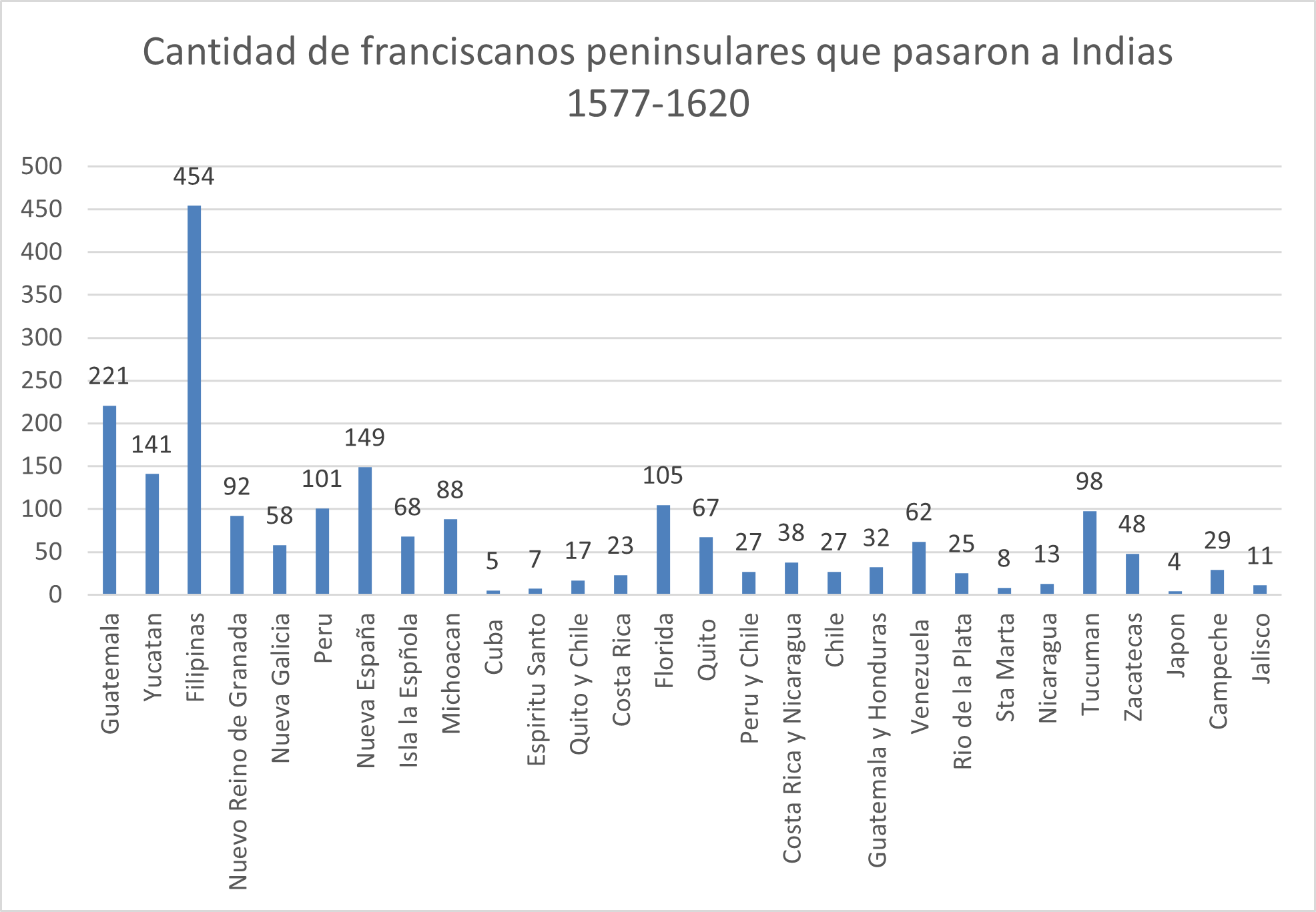 Entre 1577 y 1599, en 22 años, fueron enviados a Filipinas 176 franciscanos, y a Guatemala 119. Sin embargo, en el periodo de 1600 a 1620, casi se triplicó el número de franciscanos enviados a Filipinas, en prácticamente análogo número de años. En el caso de Guatemala, aumentó el número de franciscanos enviados de 119 en lo que quedaba del siglo XVI a 221 en el primer tercio del siglo XVII. Mientras que en los restantes lugares disminuyó el envío de franciscanos peninsulares. Por ejemplo, en la Provincia de los Doce apóstoles (Perú), sede de un virreinato ya consolidado, solo se enviaron, en los primeros 20 años del siglo XVII, 13 franciscanos peninsulares, de los 88 que llegaron entre 1577 a 1599. En cuanto a Nueva España, se triplicó el número de enviados entre 1600 a 1620, pero habría que determinar cuántos de estos, lo utilizaron solo como escala para llegar a otros lugares, como Filipinas (Luengo Gutiérrez, 2011, p. 123).