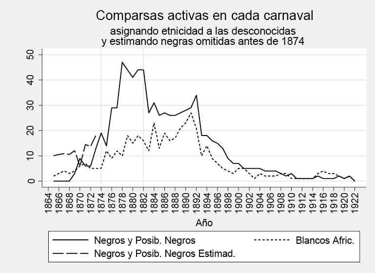 El siguiente gráfico, presentado en el trabajo mencionado, muestra la trayectoria temporal de las comparsas de afrodescendientes y de blancos “africanizantes” sobre la base de los datos que fue posible recabar, procesados estadísticamente de manera que permitiera estimar las omisiones por baches de información y asignar a alguna etnicidad posible las agrupaciones de etnicidad desconocida. El resultado es el siguiente: