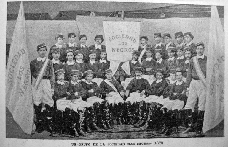 Los Negros salió por primera vez en el carnaval de 1865 y tuvo su última participación en 1870. Conformaban la comparsa alrededor de 40 jóvenes de familias que resumían, en sus propias palabras, “lo más selecto de nuestro país”. Eran todos varones e incluían apellidos que ya eran o pronto serían renombrados en la cultura y en la política. Tenían un salón propio en el que organizaban bailes y tertulias y actuaban también en teatros y en casas de familias distinguidas. Además, sostuvieron un semanario propio, del mismo nombre de la comparsa. Durante los carnavales ejecutaban música y cantaban canciones de su propia autoría y otras tomadas de zarzuelas. Las fuentes mencionan que, como parte de su orquesta, había pífanos, guitarras, violines, redoblantes, tambores y otros instrumentos de percusión y que realizaban movimientos que pretendían imitar los de los negros, de los que solo se cuenta con la descripción de “mover las caderas” al son de la música y “caminar sobre los talones” (esto último considerado por un observador una excentricidad sin relación con nada que hiciesen los negros reales). La vestimenta que usaban no evocaba lo africano: era de estilo militar europeo. Pero a ello sumaban caretas negras; al menos uno de ellos se tiznó la cara en 1870, pero no parece haber sido lo habitual. Al menos una de sus canciones era en “bozal”, el estilo de habla que pretendía imitar el castellano dificultoso de los esclavizados nacidos en África, y se sabe que algunos de ellos lo utilizaban en otras ocasiones. En 1867 prometieron desfilar en Montevideo (no está claro si lo hicieron); aparentemente, fue la primera comparsa de falsos negros de la que se tenían noticias allí, donde la costumbre sería pronto replicada (Adamovsky, 2021a).