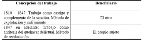 Fuente: Elaboración propia.Pero este cambio en el discurso evidenciado a fines del siglo XIX y principios del XX, no caló según lo esperado en la conciencia de los reos, en especial, en aquellos con trayectorias delictivas prominentes, quienes no adhirieron al nuevo discurso radicalizando su negación. Y es que la experiencia del trabajo-para-otros, marcó a sangre y fuego la conciencia del sujeto delictual, no solo por su ejecución, que se entendió como un castigo, sino por el sometimiento implícito a un poder que no se reconocía ni respetaba. Entonces, pese al cambio paradigmático, la nueva noción no pudo con la vieja idea de que trabajar era someterse a un-otro, fuese este otro un gobernador, un terrateniente o el propio Estado.