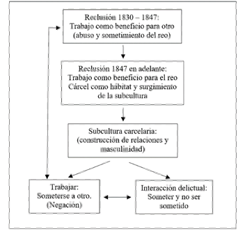 Como elemento transversal del rol asignado al trabajo, anterior a 1843, se encuentra su impronta de servir como medio para el beneficio de un “otro” (León, 2010), que actuará como núcleo comprensivo para el sujeto delincuente, quien terminará emparentando su ejecución con el sometimiento, conducta refractaria a la representación de la masculinidad y la prominencia que comenzará a forjarse al interior de la subcultura carcelaria a partir de la puesta en marcha de la Penitenciaría de Santiago en 1847.