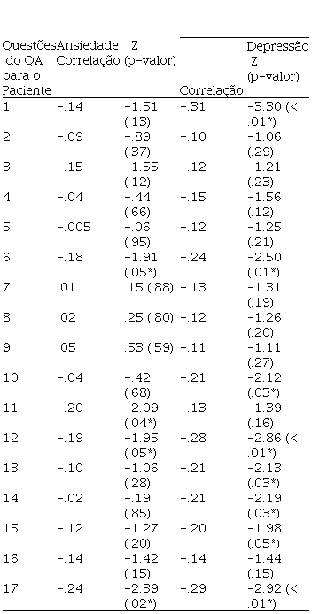 Na Tabela 11, é possível observar as correlações de Kendall entre cada uma das questões do QA e as escalas de ansiedade e depressão. Apenas as questões 6 (Z = -1.91, pvalor = .05), 11 (Z = -2.09, p-valor = .04), 12 (Z = -1.95, pvalor = .05) e 17 (Z = -2.39, p-valor = .02) apresentam correlações negativas fracas com os sintomas de ansiedade, sendo estatisticamente significativas a um nível de α = .05. Em contrapartida, oito das 17 questões do QA apresentam correlações negativas fracas com os sintomas de depressão. Isso significa que, conforme se aumenta os valores da escala de ansiedade e depressão, há uma tendência de os pacientes indicarem níveis mais baixos na escala Likert das questões do QA.