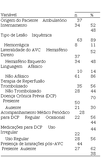 A pesquisa foi composta por 52% de pacientes advindos do Ambulatório de Neurologia do hospital de referência. 89% receberam o diagnóstico de AVC Isquêmico. Entre estes 56% foram submetidos à terapia de reperfusão (Trombólise). Quanto à lateralidade do insulto, 52% (n=37) tiveram o hemisfério direito afetado e 14% dos pacientes possuíam afasia de condução, sendo avaliados com o auxílio de instrumentos para comunicação alternativa (prancha de comunicação e/ou escrita).