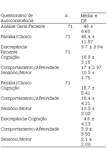 Entretanto, há casos particulares de alguns itens do QA, como a questão 8 (Quão bem você pode movimentar seus braços e pernas se comparado com antes da lesão?), a qual se refere ao déficit sensório/motor, em que a autoconsciência do paciente não foi mantida. Os pacientes tenderam a pontuar notas maiores para si do que as notas atribuídas por suas famílias. Isso indicou um déficit na autoconsciência quanto ao real estado em que eles realmente se encontravam. Em outras palavras, acreditavam apresentar uma melhor capacidade motora, que, na verdade, estava gravemente prejudicada.