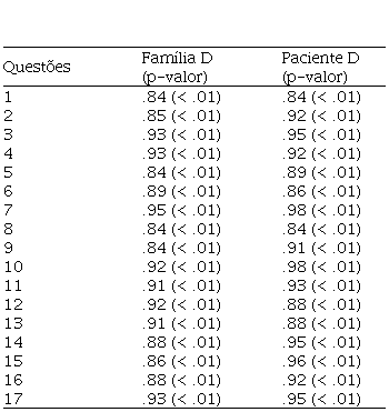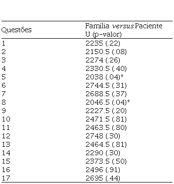 As famílias tenderam a pontuar seus familiares com notas em média iguais ou bastante próximas para oito das 17 questões, quais sejam: 4, 9, 10, 11, 13, 14, 15 e 16. Além disso, ao considerar as notas medianas, observa-se que em 12 das 17 questões os familiares pontuaram os pacientes com notas iguais, quais sejam: 2, 3, 6, 7, 8, 10, 11, 12, 14, 15, 16 e 17.