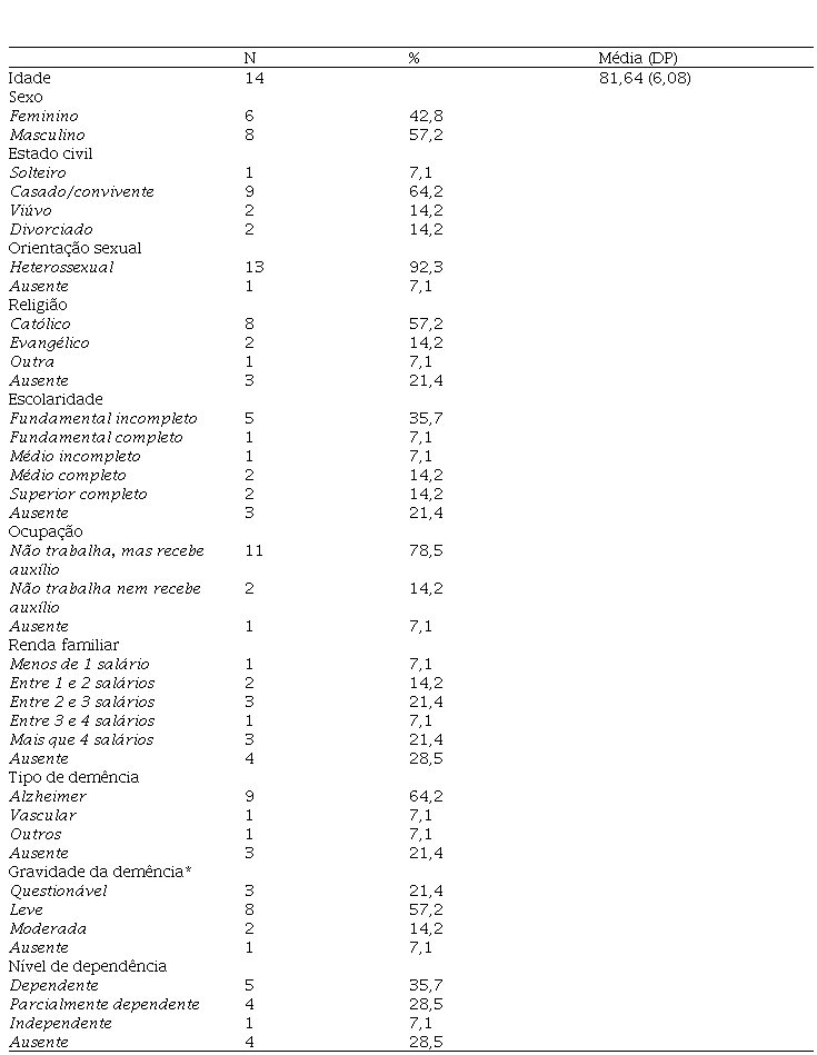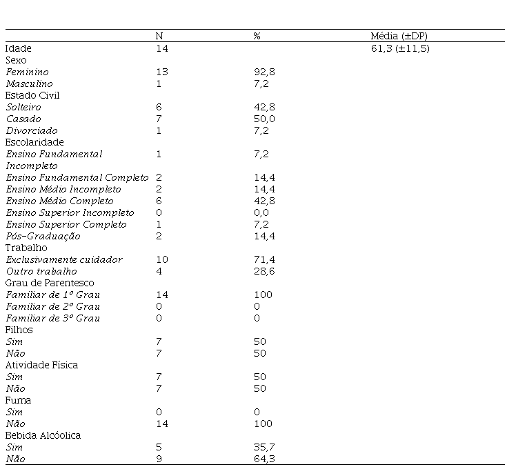Obteve-se uma amostra de 14 pacientes e 14 cuidadores. Seguem, na Tabela 1, os dados sociodemográficos dos pacientes.