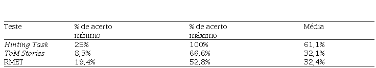 A pontuação mais alta da amostra ocorreu no Hinting Task, sendo o percentual de acerto consideravelmente superior às pontuações do ToM Stories e Reading the Mind in the Eyes Test.