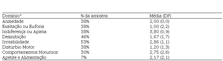 A irritabilidade se mostrou o sintoma mais presente nos pacientes, seguido pela desinibição. No entanto, na análise do grau de perturbação do sintoma, o que se mostrou com maior grau foi a indiferença ou apatia.