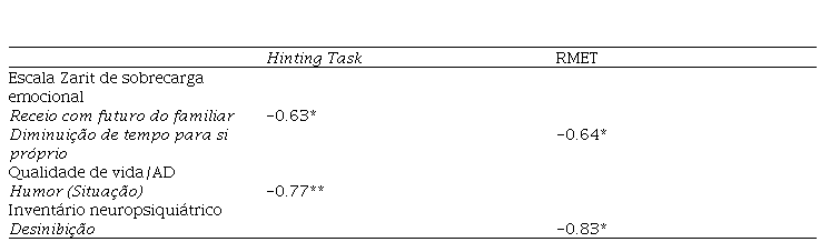 Na Tabela 6, apresentam-se apenas as correlações estatisticamente significativas entre a escala Zarit e os testes de cognição social.