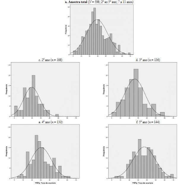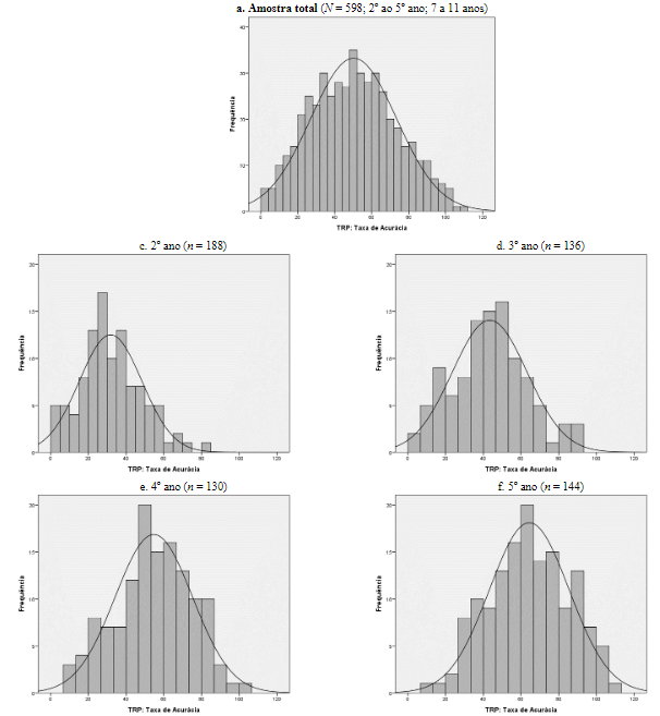 A variável Taxa de Acurácia demonstrou melhores índices de validade da estrutura interna (Tabela 2). A Taxa de Acurácia apresentou uma distribuição normal padrão, sendo simétrica e mesocúrtica, tanto para o TRP (Figura 1) quanto para o TRPp (Figura 2). Essa normalidade foi confirmada pelos resultados não significantes (p > 0,31) dos testes de Kolmogorov-Smirnov e de Shapiro-Wilk (exceto a assimetria positiva no 2º ano para o TRP, assinalada em negrito na Tabela 2).