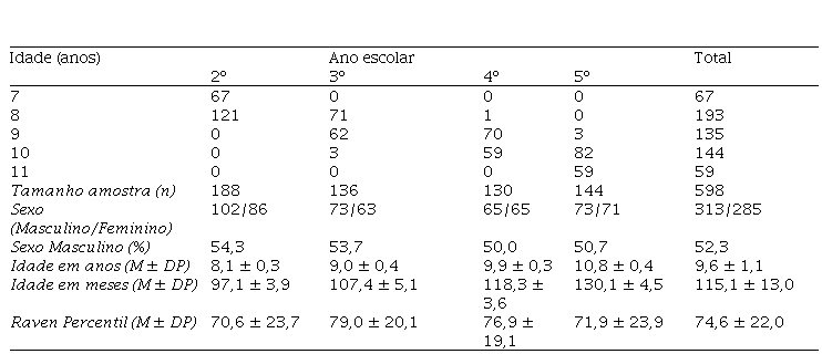 Participaram da pesquisa 598 alunos voluntários, 52,3% do sexo masculino, de 7 a 11 anos (M = 9,6 ± 1,1 anos), do 2º ao 5º ano do Ensino Fundamental, todos falantes nativos do Português Brasileiro (ver Tabela 1). Conforme a listagem de todas as instituições registradas na cidade de Belo Horizonte, Minas Gerais, fornecida pela Superintendência Regional de Ensino, foram sorteadas oito escolas estaduais, estratificadas em diferentes regionais da cidade, não havendo recusa das instituições em participar da pesquisa. Em cada uma das 102 salas de aula, seis alunos foram selecionados, de forma aleatória (sorteio a partir da lista de presença). Detalhes adicionais sobre os participantes e sobre a bateria de avaliação cognitiva a que foram submetidos, incluindo a descrição dos Instrumentos e Procedimentos, encontram-se em diferentes estudos (Pinheiro et al., 2017; Vilhena et al., 2016; Vilhena & Pinheiro, 2016, 2020).