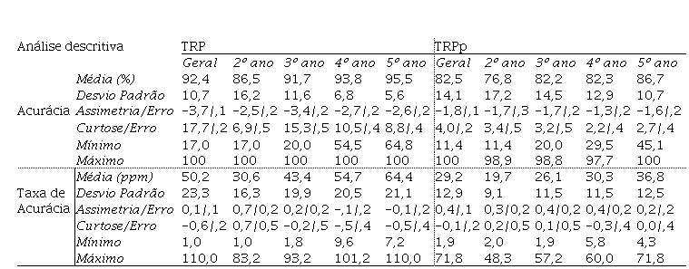 A Taxa de Acurácia apresentou significante efeito de escolaridade para o TRP [F(3, 594) = 63,2, MSE = 391,4, p < 0,001] e para o TRPp [F(4, 594) = 47,3, MSE = 129,2, p < 0,001]. Os Intervalos de Confiança de 95% da Taxa de Acurácia não se sobrepuseram, tanto para o TRP (2º ano: 27,3–33,8; 3º ano: 39,6–47,3; 4º ano: 51,2–58,3; 5º ano: 60,9–67,9), quanto para o TRPp (2º ano: 17,9–21,5; 3º ano: 23,8– 28,2; 4º ano: 28,4–32,3; 5º ano: 34,8–38,9).