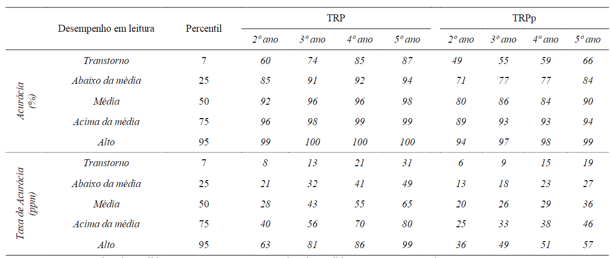 As normatizações dos escores do TRP e do TRPp foram apresentadas, uma vez que os instrumentos mostraram fontes de evidências de fidedignidade e validade satisfatórias para alunos do 2º ao 5º ano do ensino fundamental. Uma força do estudo é a amostragem aleatória, estratificada e com tamanho estatístico adequado. Nesse sentido, foi possível estabelecer normas de conversão das variáveis Acurácia e da Taxa de Acurácia para o seu correspondente Percentil e classificação do desempenho de leitura.