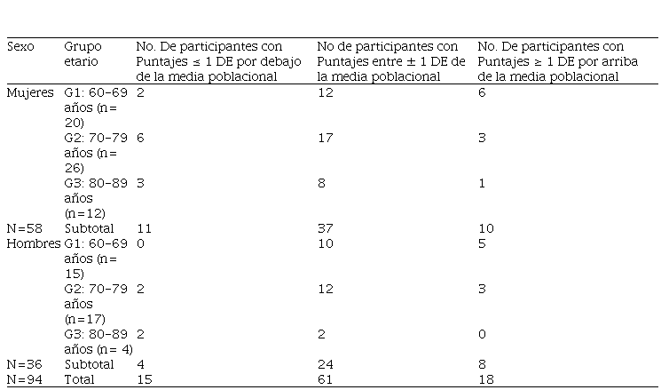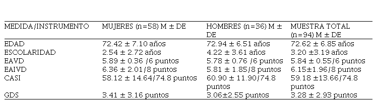 De los 94 participantes en este estudio, 58 (62.7%) fueron mujeres y 36 (37.3%) fueron hombres. En la tabla 1 se puede ver que el rango de edad en la población total osciló entre 60 y 89 años. Para las mujeres el promedio de edad fue de 72.42 años (rango de 60-89) y para los hombres de 72.94 años (rango de 61-88).