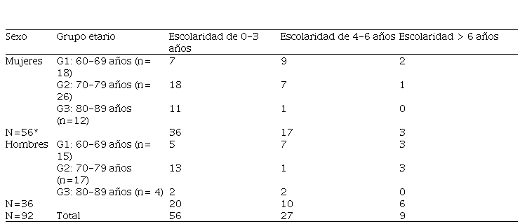 Para facilitar el análisis de los resultados, la muestra se dividió por décadas de edad en tres grupos: grupo 1 (60 a 69 años), grupo 2 (70 a 79 años) y grupo 3 (80-89 años) y por sexo. Se ha reportado mayor riesgo de deterioro cognitivo y síntomas depresivos con el aumento de edad, por lo que se decidió dividir a la muestra por décadas de edad para facilitar también las comparaciones de las diferentes variables entre grupos de edad.