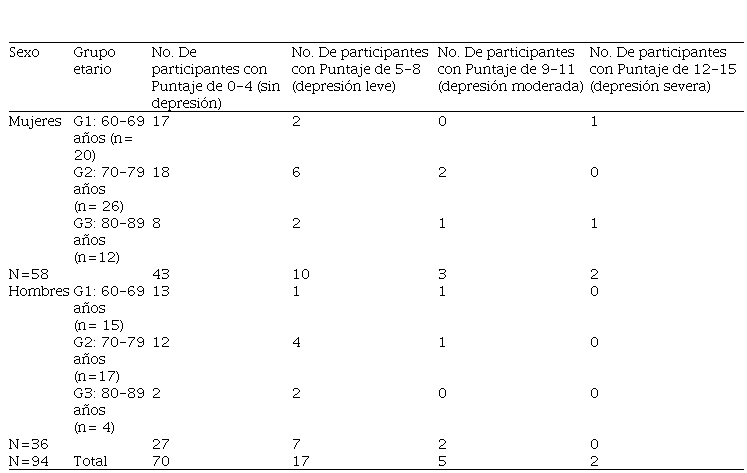 Algunos trabajos consideran clasificar como “depresión” puntajes ≥ 5 (Sinha et al., 2013), y siguiendo este criterio, en la presente muestra 24 AM (25.53%) podrían clasificarse con depresión; de ellos 15.96% eran mujeres y 9.57% eran hombres. Sin embargo, si se aplica el criterio de más de 8 puntos en la GDS -como en otros estudios- (Park et al., 2013), solamente 7 participantes de esta muestra (7.45%), 5 mujeres y 2 hombres, pudieran considerarse con “depresión”. Las puntuaciones de depresión moderada y severa se presentaron en 5 mujeres y solo 2 hombres presentaron puntajes de depresión moderada, lo cual indica una mayor afectación en las mujeres pertenecientes a esta población.