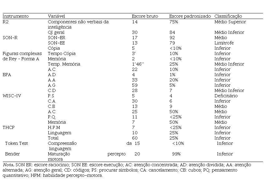 Para a pontuação do desempenho de Pablo, foram considerados os escores interpretativos indicados no manual de cada instrumento (percentil, ponto ponderado, escore T).