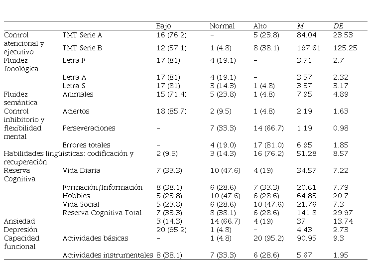 Los índices de reserva cognitiva en la muestra estudiada resultaron normales en su mayoría. Se constataron índices de normalidad en cuanto a las manifestaciones de ansiedad (66.7%) y ausencia de signos clínicos de depresión (95.2%). El 92.5% 95.2% de los participantes resultaron funcionalmente independientes para la realización de actividades básicas de vida cotidiana; mientras que los valores de dependencia/independencia para la realización de actividades instrumentales de vida cotidiana, resultaron heterogéneos.