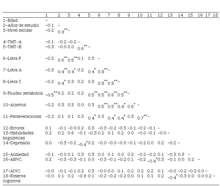 Se encontraron asociaciones estadísticamente significativas entre varias de las variables de estudio. La edad correlacionó de forma negativa con la fluidez semántica; mientras que la fluidez fonológica mostró relaciones fuertes y positivas con el nivel de escolaridad alcanzado, los años de escolarización y el control atencional ejecutivo. A su vez, el control ejecutivo exhibió correlaciones fuertes y negativas con la presencia de depresión, y mostró correlaciones fuertes y positivas con la fluidez verbal semántica. La ansiedad no mostró correlaciones con ninguna de las variables exploradas. Se encontró una correlación fuerte y negativa entre los errores perseverativos en el control inhibitorio y las ABVC. La reserva cognitiva correlacionó fuerte y de modo negativo con las habilidades lingüísticas de denominación y recuperación