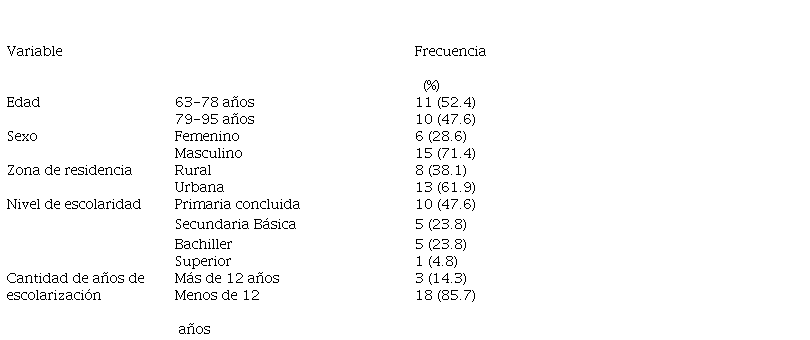 La muestra quedó compuesta por 21 adultos mayores supuestamente sanos, lo cual representó el 25% de la población. Las edades oscilaron desde los 63 hasta los 95 años. Existió un predominio del sexo masculino. El grado de escolaridad alcanzado mayormente fue el de Educación Primaria (47.6%); y el 85.7% de la muestra contaba con menos de 12 años de estudio (Tabla 1).