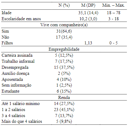 Os dados socioeconômicos são apresentados abaixo com os seguintes dados: 65,6% são mulheres; faixa de idade entre 18 e 78 anos; média de 35 anos de idade; 64,6% vivem com algum companheiro; tem em média 1 filho; 37,5% está desempregada; 45% têm renda entre 1 a 2 salários mínimos (Tabela 1).