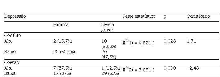 Na primeira parte dos resultados, o índice de Depressão Beck foi dividido em duas categorias a partir do ponto de corte do instrumento original (Gorestein & Andrade, 1998). Do total, 56,1% dos participantes apresentaram pontuação acima de 14 pontos. Os valores dos aspectos positivos do clima familiar positivo também foram dicotomizados para testar a hipótese se os fatores familiares aumentam as chances de ter um quadro de depressão leve a grave. A Tabela 3 mostra a associação entre sintomas de depressão e as classificações do conflito e coesão familiar. Notaram-se associações significativas entre alto conflito, baixa coesão com a presença mais alta de sintomas de depressão. Os indivíduos que possuem um alto conflito têm até 1,7 vezes mais chances de apresentar sintomas leves a graves de depressão. Em contrapartida, ter uma alta coesão representa um fator protetivo, pois estes indivíduos possuem 2,48 vezes menos chances de apresentar depressão leve a grave (Tabela 3).