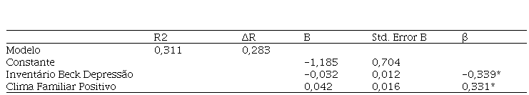 Na terceira etapa dos resultados, foi construído um modelo de regressão linear múltipla entre os aspectos positivos do clima família e o Inventário Beck de Depressão para a predição do valor geral da qualidade de vida. A tabela 5 mostra os resultados da regressão linear usando o Inventário Beck de Depressão e o Clima Familiar Positivo (coesão mais apoio) para a predição de qualidade de vida. O método de entrada foi utilizado para construir o modelo de regressão. Os resultados da construção do modelo indicam que tanto o Inventário Beck de Depressão assim como o Clima Familiar Positivo explicam a variação da qualidade de vida. O modelo com essas variáveis explicam (ΔR = .28) do total da qualidade de vida. A hipótese de multicolinearidade foi testada e verificada que os construtos eram independentes (VIF<10 e Tolerância>0,20). Os critérios de linearidade e homoscedasticidade foram cumpridos.