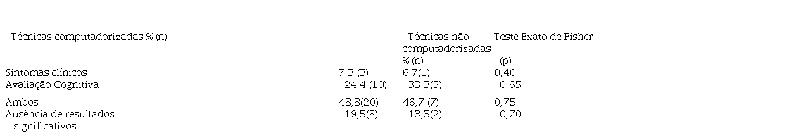 O tipo de treino cognitivo (computadorizado ou não) não resultou em tipos diferentes de efeitos (na melhora do desempenho cognitivo ou na melhora dos sintomas de TDAH). A Tabela 2 apresenta a frequência de estudos que tiveram efeitos significativos em cada modalidade e a ausência de diferença entre grupos (treino com recurso computadorizado ou não) com base no Teste Exato de Fisher.