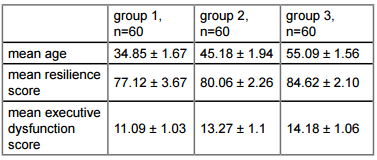 Group 1 includes 60 subjects between 30 and 40 years old, mean age 34.85 ± 1.67 years old. Resilience scores ranged between 69 and 82, mean resilience scores 77.12 ± 3.67. Executive dysfunction scores ranged between 10 and 14, mean scores 11.09 ± 1.03.