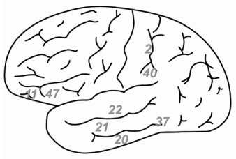 En el área dorsal posterior se encuentran el giro angular y el giro supramarginal de la corteza parietotemporal, asociándose esta zona con el análisis de las palabras. La otra zona posterior más ventral se ubica en la región posterior del giro fusiforme entre la transición de la corteza occipital a temporal, en donde se presume que su función es el reconocimiento visual de las palabras. La tercera región, establecida en la corteza frontal, aledaña al Área de Broca (AB) en la zona inferior del lóbulo frontal izquierdo, se encargaría de la comprensión y la utilización de las reglas gramaticales ( Preilowski & Matute, 2011 ).