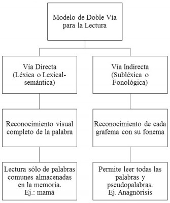 Bravo (2013) menciona que existiría una supuesta doble vía para la lectura, una indirecta, subléxica o fonémica ( Rosselli et al., 2006 ) que requiere descomponer las palabras para decodificarlas y otra directa, léxica o lexical-semántica ( Rosselli et al., 2006 ) que implica el reconocimiento visual de las palabras escritas ( Figura 3 ).