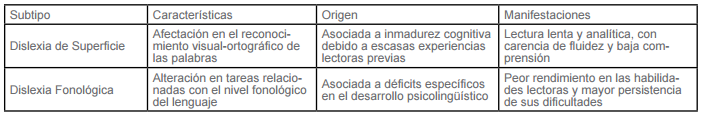 Por ende, las personas sin problemas en el proceso lector activan de manera simultánea ambas vías, utilizando tanto la memoria visual-ortográfica como el análisis segmental fonológico. En cambio las personas con trastornos lectores severos y los disléxicos fallarían en alguna de ellas. Por lo expuesto anteriormente, es posible distinguir entre dos subtipos de dislexia, una de origen visual, denominada dislexia de superficie, asociada con una inmadurez cognitiva debido a insuficiencias en la percepción y en la memoria visual debido a escasas experiencias lectoras previas, lo que origina una afectación en el reconocimiento visual-ortográfico de las palabras y manifestando una lectura lenta y analítica, con carencia de fluidez y baja comprensión; y otra de origen fonológico o dislexia fonológica, caracterizada por alteraciones en las tareas relacionadas con el nivel fonológico del lenguaje, las cuales son bastantes persistentes y provendrían de deficiencias específicas en el desarrollo psicolingüístico del niño ( Bravo, 2013 ) ( Tabla 1 ).