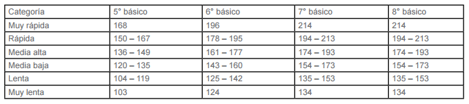 Para determinar la velocidad de lectura, se debe consignar el número de palabras leídas en un minuto, en donde se deben restar aquellas que son mal leídas, omitidas, inventadas y en donde la ortografía puntual no se respete. Posteriormente, se debe contrastar el número de palabras leídas con una tabla confeccionada para ello (ver Tabla 2 ), en donde sale el número de palabras esperadas que lea para el curso en que se encuentra, clasificando su desempeño en seis tipos de categorías (ver Tabla 2 ), en donde “Muy Lento” es la inferior y “Muy Rápido” lo más alto ( Ministerio de Educación de Chile, 2008 ).