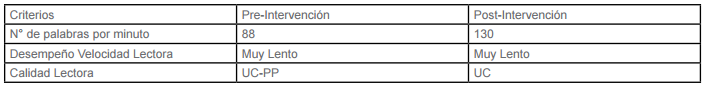 Antes de comenzar la evaluación el adolescente no lograba segmentar adecuadamente los fonemas en palabras de más de 6 sílabas. Sólo leía 88 palabras (91 aciertos y 3 errores) con una lectura por Unidades CortasPalabra a Palabra (UC-PP) ( Ministerio de Educación de Chile, 2008 ), obteniendo un rango de desempeño de “Muy Lento”, debido a que leía menos de 134 palabras por minuto ( Ministerio de Educación de Chile, 2008 ) y evidenciando una falta en la automatización del proceso lector.