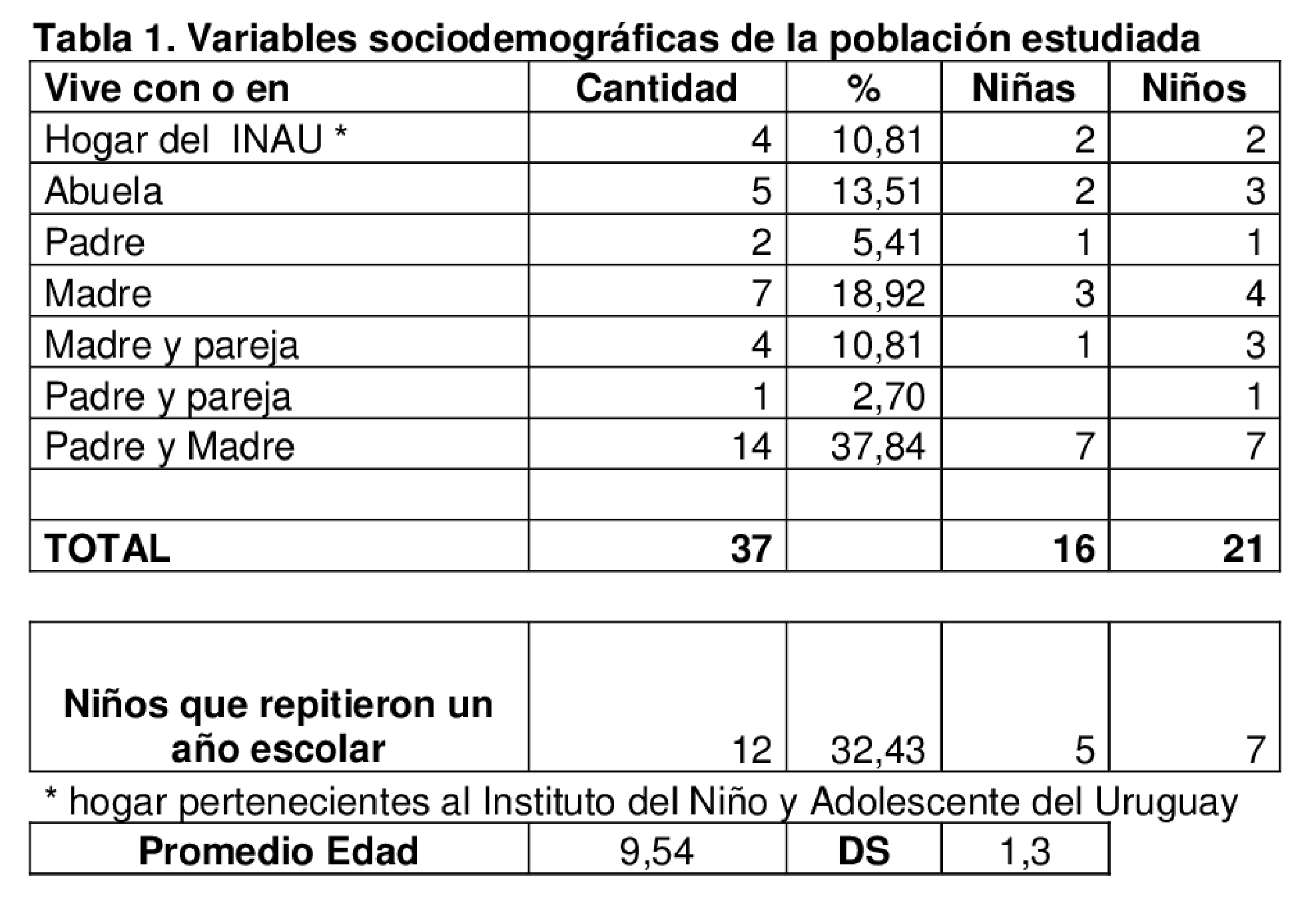 Para este estudio participaron 37 niñas y niños (21 varones y 16 niñas), con edades comprendidas entre los 8,3 años y los 11,9 años, con un promedio de edad de 9,5 y un DS de 1,3. que se encuentran en situación de vulnerabilidad social del barrio Casavalle de Montevideo, seleccionados por las escuelas de la zona a principios del año 2013 según la Tabla 1.