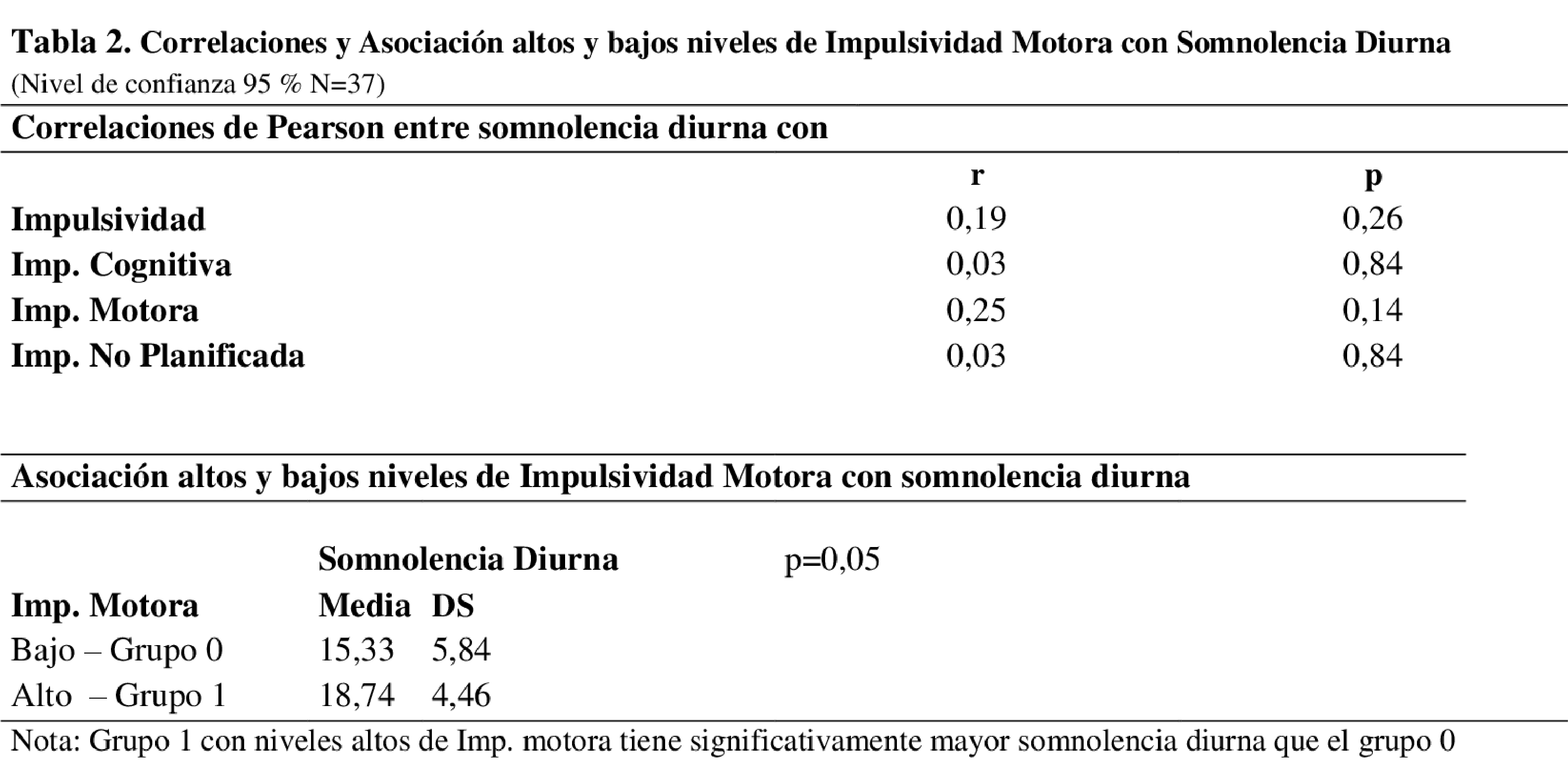 Se encontró una asociación significativa (p=0.05) de altos y bajos niveles de impulsividad motora respecto a la somnolencia diurna (Tabla 2). Con los valores de impulsividad motora, se tomó la mediana, y se diferenciaron 2 grupos: