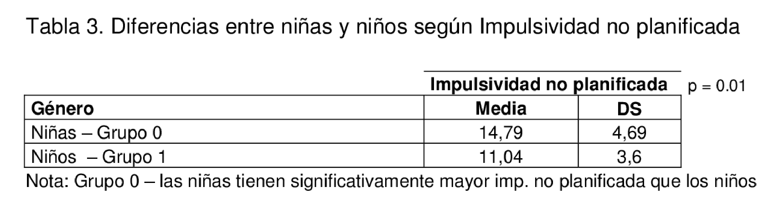 Llamó la atención, que las niñas tuvieran significativamente más impulsividad no planificada que los niños, es decir que las niñas tendrían una tendencia a no planificar y a vivir más en el presente. Se esperaría que hubiera sido al revés, que los niños tuvieran mayor impulsividad que las niñas. Es de acotar, que no se han encontrado diferencias de género en los diferentes estudios ya presentados en este artículo. Este pequeño hallazgo, abre a la pregunta sobre si los efectos de las SVS afectan más a las niñas, o al menos en lo que refiere a la impulsividad, o hay aspectos socioculturales que están subyacentes al mismo modelando estas diferencias.