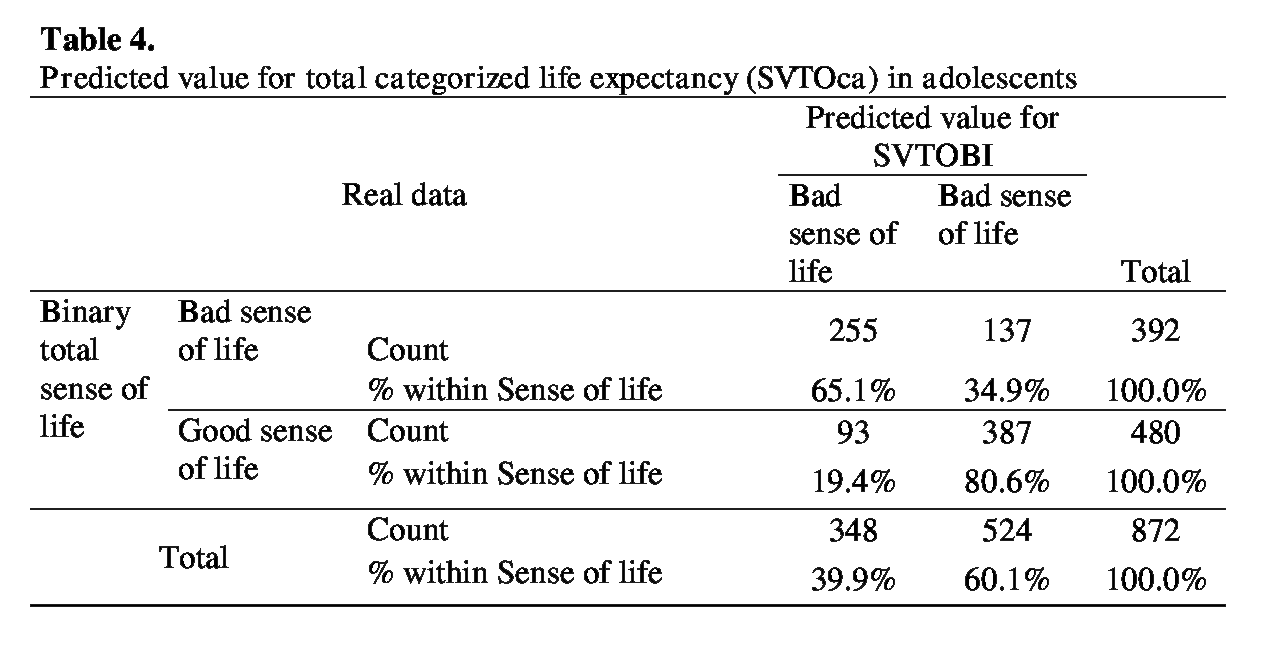 Based on the factors of standardized importance identified in the neuronal network, in probabilistic terms, it was found that in adolescents with bad inner sense it is predicted that 65% of them (255 adolescents) will continue to maintain a bad sense of life and 34.9% will improve to an inner achievement of good sense.