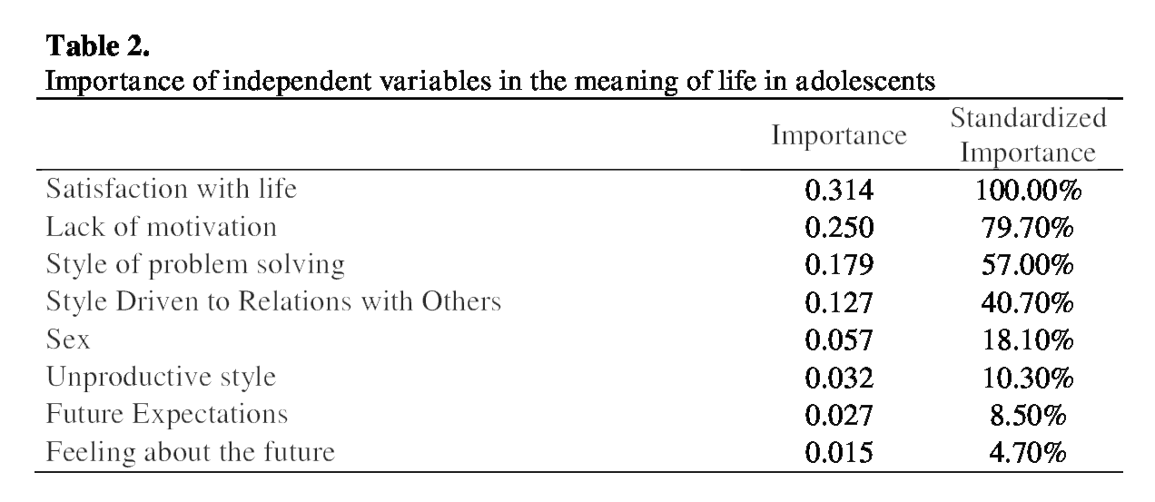 In this sense, the research tries to test an explanatory model of the purpose of life in adolescents and to propose a predictive model for the meaning of life based on the values of the predictor variables: coping styles, satisfaction with life and hopelessness; through the application of neuronal networks of multikappa perceptron.