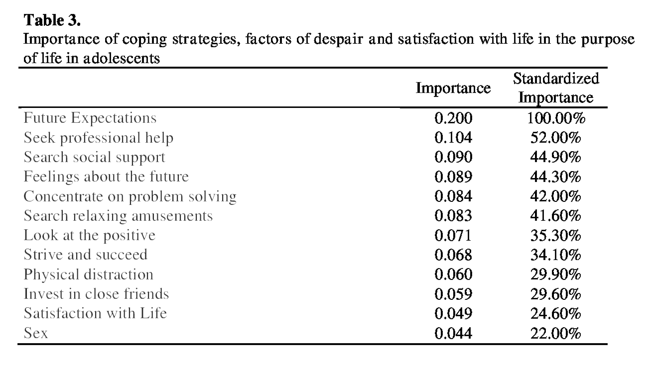 Likewise, the neural network has identified the coping styles, the factors of hopelessness and satisfaction with life that explain and predict the meaning of life in adolescents, within which it considers as the most important Future Expectations, followed by Search Professional help, Search Social help, Feelings about the future, concentrate on Solving problems, Relaxing or fun; and as those factors that influence but not with high percentages, one has the strategy to focus on the Positive, Endeavor and succeed, Physical Distraction, Invest in Intimate Friends, Satisfaction with life and sex. The factors that do not predict in the student the inner attainment of bad sense or the inner attainment of good sense are all strategies of the Unproductive coping style and the lack of motivation factor of hopelessness (Table 3).