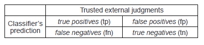 For classification tasks, the terms true positives (tp), true negatives (tn), false positives (fp), and false negatives (fn) compare the results of the classifier under test with trusted external judgments (Table 1). The terms positive and negative refer to the classifier’s prediction and the terms true and false refer to whether that prediction corresponds to the external judgment. In a binary classification scenario as the one faced in this work, the predictions made by the classifier are usually interpreted as a confusion matrix like the one shown below: