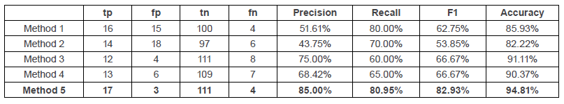 Method 1 uses as document model the PoS of all words, retaining only nouns, adjectives and adverbs. Given the high dimensionality of the document models obtained, then dimensionality reduction is performed using the SVD technique and the 100 most significant components are finally those composing the document models used as input by the classifier. Then, a deep learning approach is trained using Tanh as rectifier. First row of Table 2 reports the results achieved with this method. As it can be observed, the accuracy of the classifier is quite good (85.93%) since almost all negative samples were correctly classified and the same occurs with the positive samples. As there are only four positive samples incorrectly classified (fn column), a high recall value (80%) is expected. However, given that the test set is unbalanced, the fifteen false positive samples –that represent 13% of the true negative samples– severely affect the classifier’s precision (51.61%) since they approximately represent half of the samples predicted as positives, and hence the classifier performs a little better than random guessing. Finally, the F1 measure for this method results in a low value of approximately 63%, since the low precision achieved reduces the good recall value obtained.