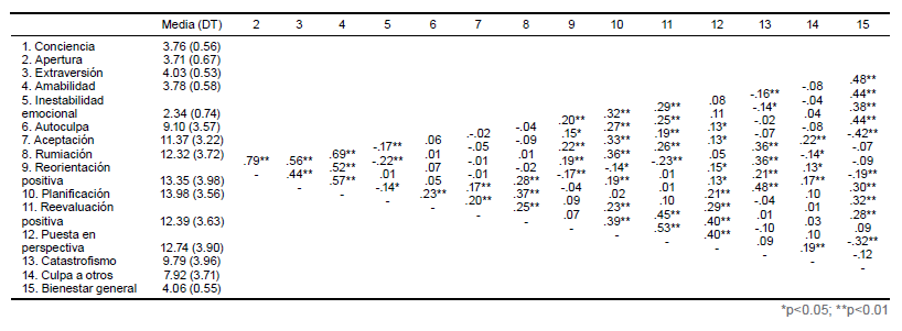 En la tabla 1 observamos que la variable de personalidad inestabilidad emocional presenta correlaciones significativas prácticamente con la totalidad de las variables de regulación emocional y con la medida de calidad de vida general. De las nueve estrategias de regulación emocional valoradas, encontramos que tan solo cuatro de ellas (autoculpa, aceptación, rumiación y culpa a otros) no presentan relación con ninguna de las variables de personalidad, a excepción de la inestabilidad emocional. La extraversión y la amabilidad, presentan correlaciones sólo con estrategias adaptativas de regulación emocional, y sin embargo, conciencia y apertura, presentan correlaciones significativas tanto con estrategias adaptativas de regulación emocional como con estrategias desadaptativas. Todas las variables de personalidad presentan correlaciones significativas con la medida general de bienestar. Aunque es el caso de la inestabilidad emocional dónde se observa el mayor número de correlaciones significativas respecto a las variables de regulación emocional, la magnitud de las mismas es en algunas ocasiones débil (concretamente en el caso de la aceptación, la reorientación positiva y la planificación). Igualmente, pueden señalarse como correlaciones débiles las observadas entre conciencia y catastrofismo, apertura y reorientación positiva, apertura y catastrofismo, extraversión y puesta en perspectiva, y amabilidad y puesta en perspectiva.